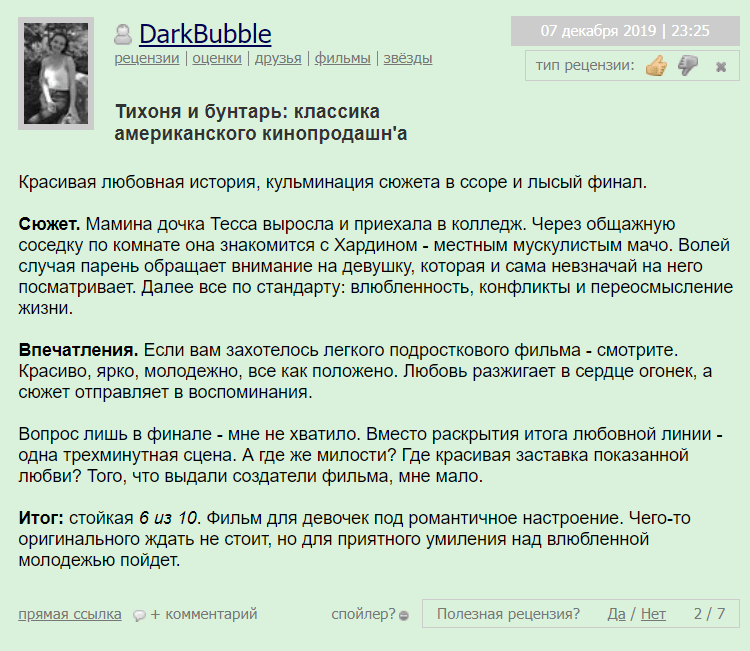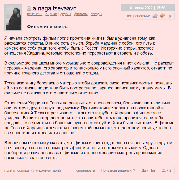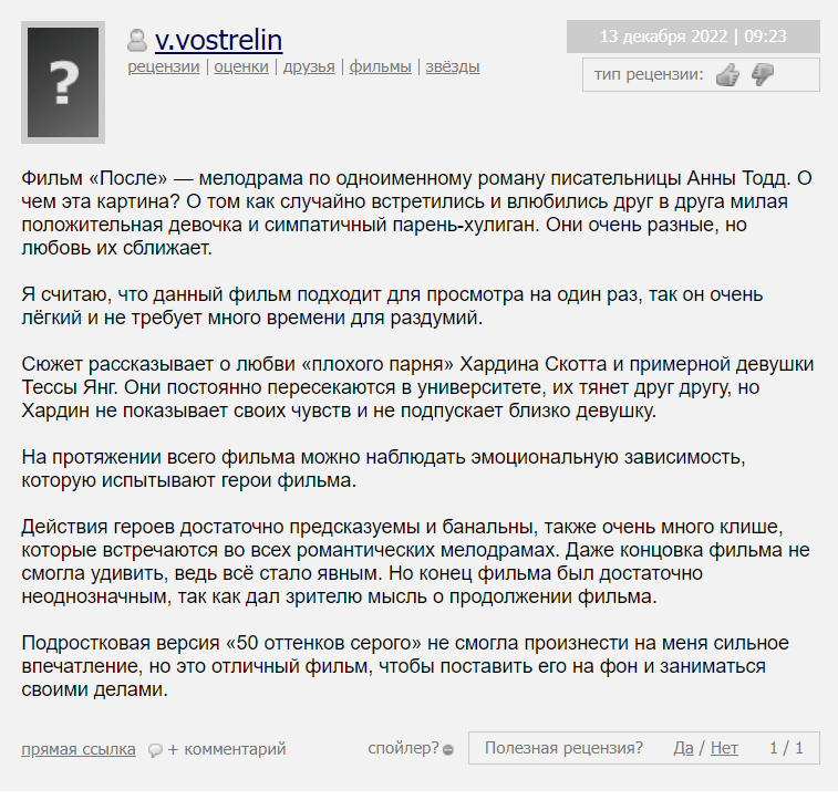 Франшиза «После» одновременно очень популярна и неоднозначна. Она вполне соответствует своему жанру, использует стандартные для него клише и ничем не удивляет ни с точки зрения сюжета, ни с точки зрения смысла.